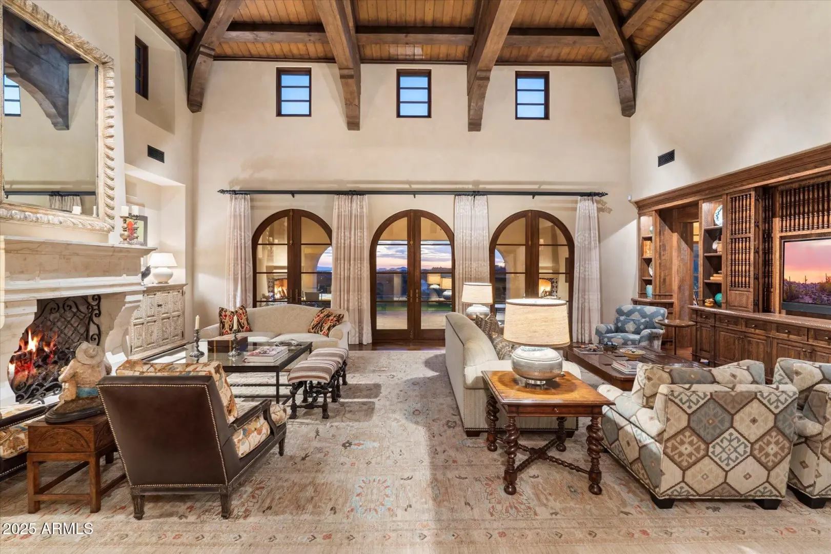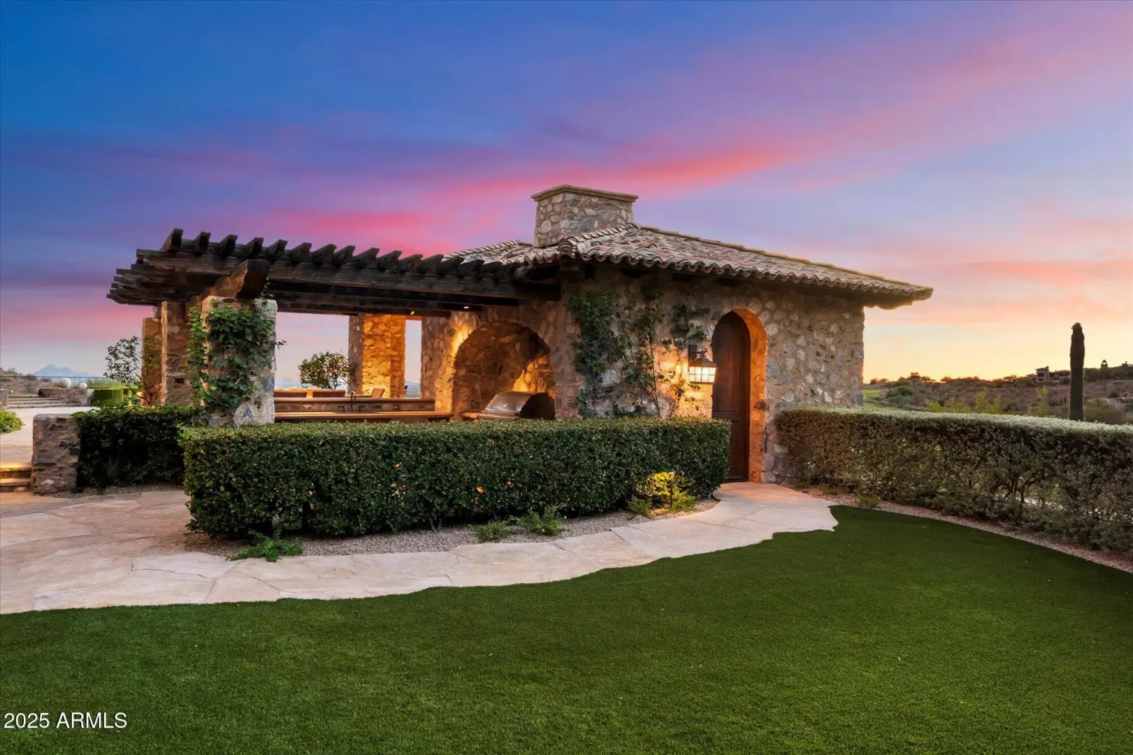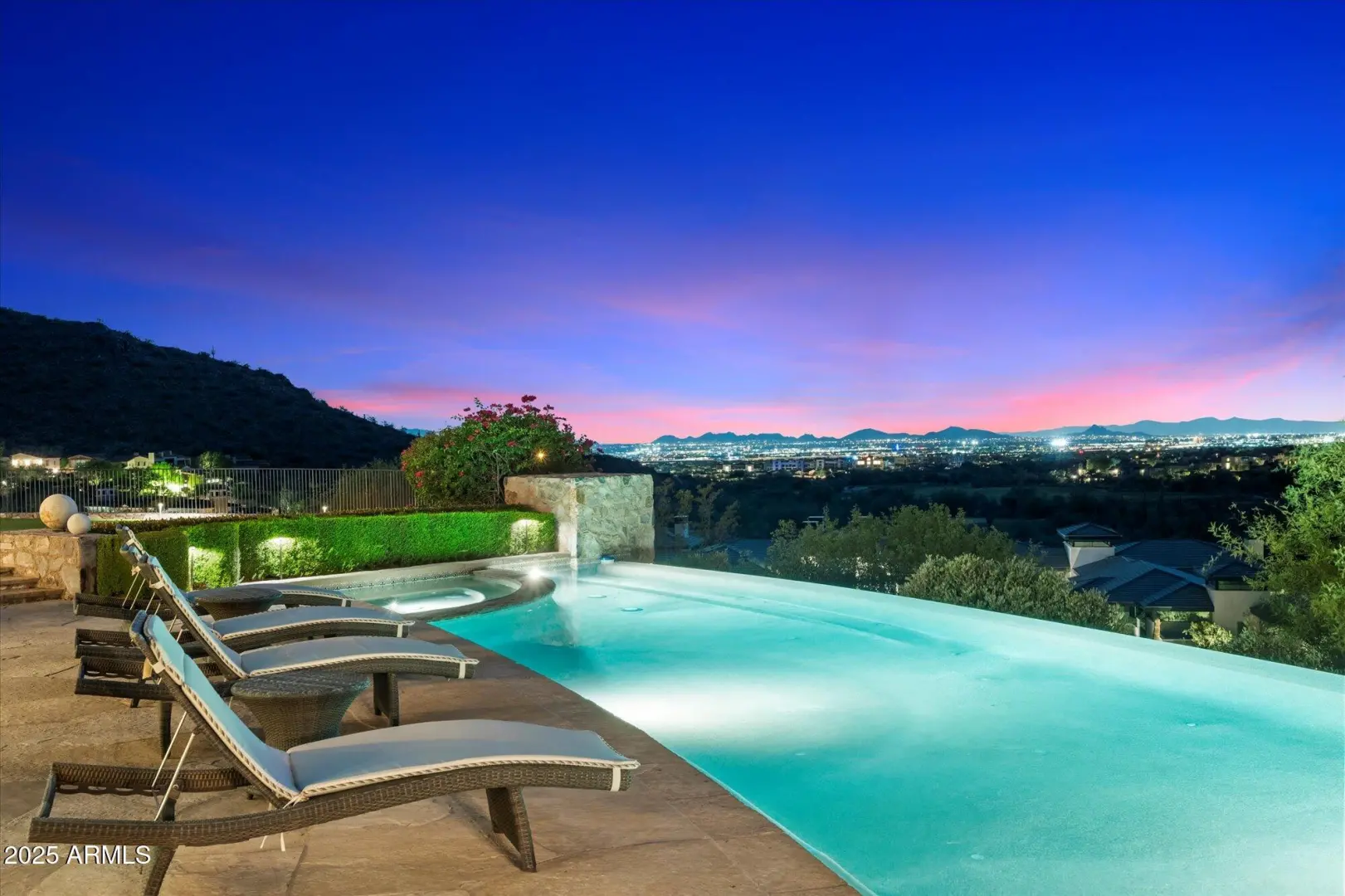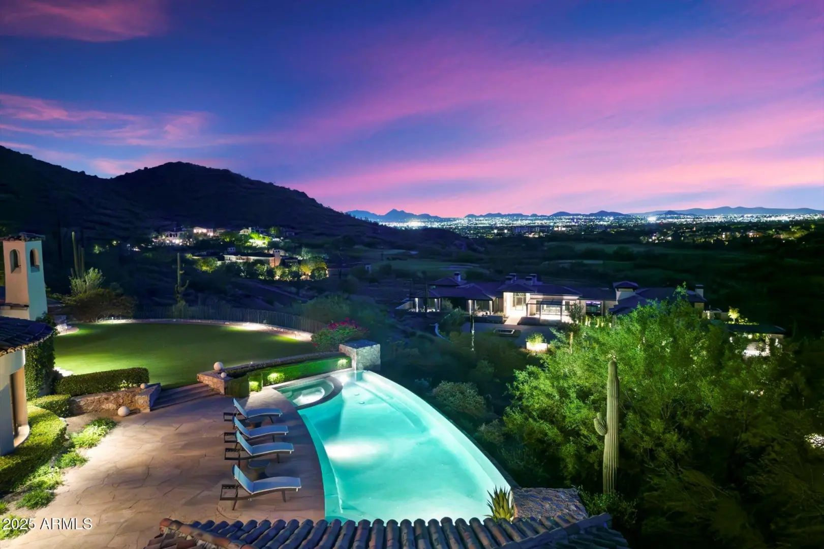 Warm and welcoming, nestled on a flat pad, motor court and zero-grade entry both at the main house and detached guest house. Access front-and-rear yard without elevation changes. Secondary family room, wet bar and additional bedrooms are all on the upper level, offering views. Enjoy a sprawling front row seat experience of Silverleaf's vibrant golf course, diamonds in the skies and city lights below at night and captivating mountain views throughout the day. Flawlessly crafted; meticulously maintained by valley's renowned luxury home builder, Desert Star Construction. This signature address encompasses over 9 acres; 13,961 square feet of living space to including 1,789 SF 2-bedroom detached guest home. Quick move-in, Golf Membership and Furnishings can be Available. Easy to show.