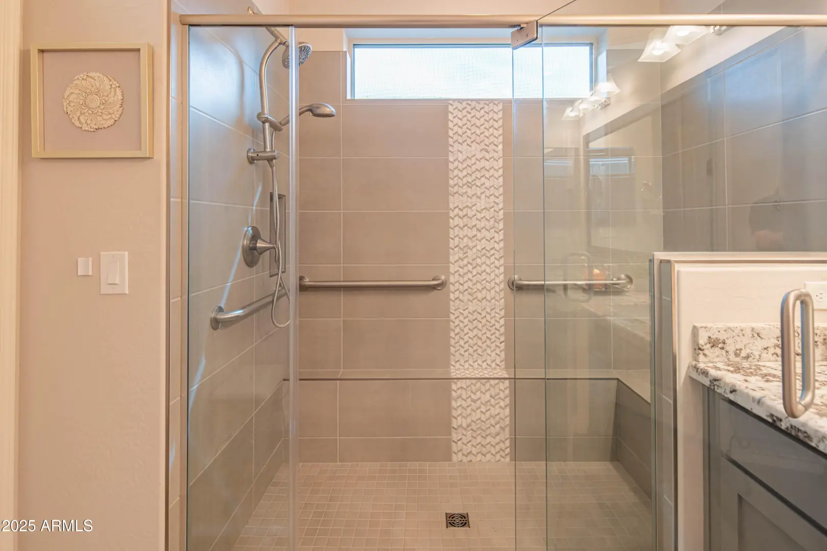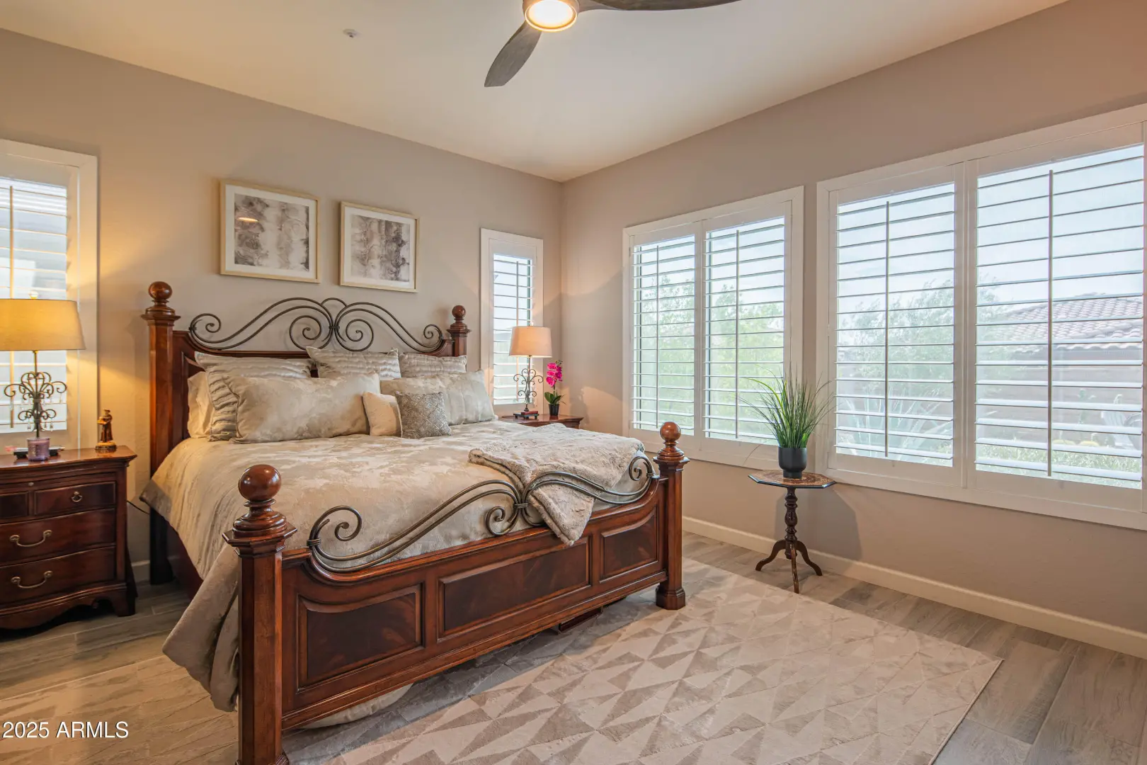 Welcome to your dream retreat in Trilogy at Vistancia, Peoria, AZ. This rarely available three-bedroom Montage Model spans 2,384 sq ft and includes upgrades galore that rival a model home. Inside, wood-look tile flooring runs throughout, complemented by plantation shutters. The spacious great room opens through an extended sliding door to the patio, complete with electric blinds for convenience and comfort. The gourmet kitchen features a gas stove, stainless appliances, custom cabinetry, and drawers beneath the stove for added storage and organization. A flexible bonus area offers space for an office, hobby room, or extended living space. Two private primary suites with custom-tiled showers provide comfort and privacy, while a third bedroom and bathroom add versatility.