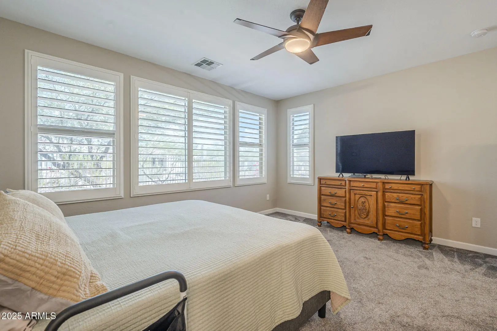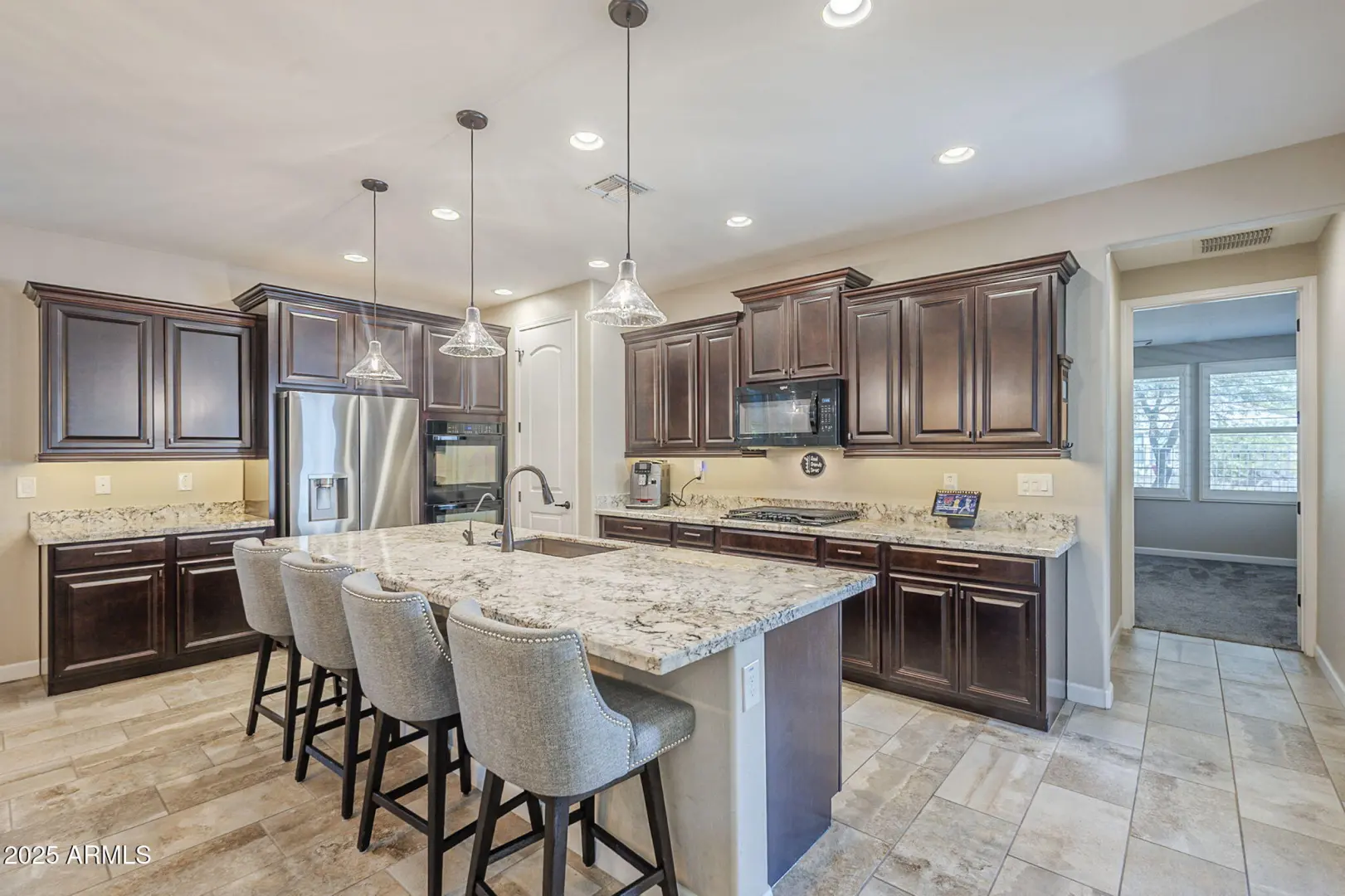 Premier 55+ community of Victory at Verrado 3 bed/2 bath home! Enjoy resort-style living with golf, pickleball, tennis, dining, pools, fitness, spa, & endless outdoor activities. Well-maintained home offers new interior paint, landscaping system, & refrigerator. Inside features 10-ft ceilings, 9-ft doors, large windows with plantation shutters, and timeless finishes. Open kitchen with gas stove, double wall ovens, granite counters, and oversized island. Spacious Primary Suite with dual sinks, glass shower, and walk-in closet, split from guest bedrooms. Entertain outdoors with an extended paver patio, built-in gas infrared BBQ, view fencing backing to a walking path, and stunning White Tank Mtn views. Perfect low-maintenance lock-and-leave home or year round active lifestyle living!