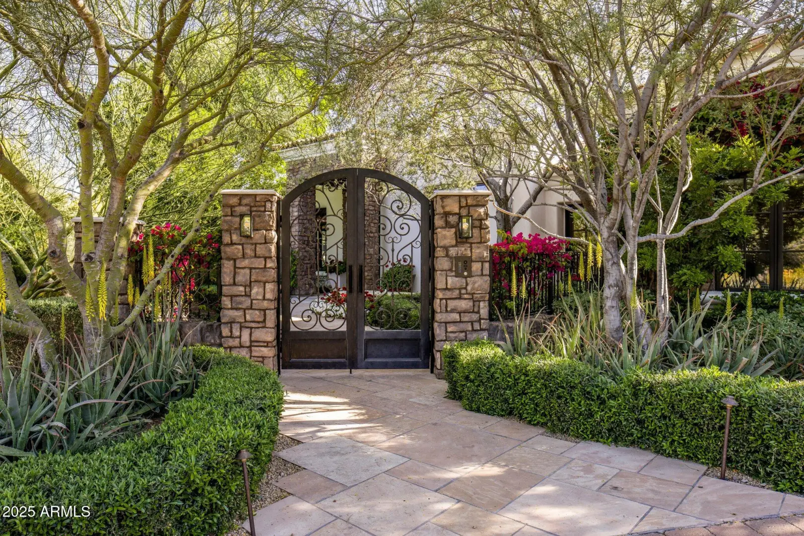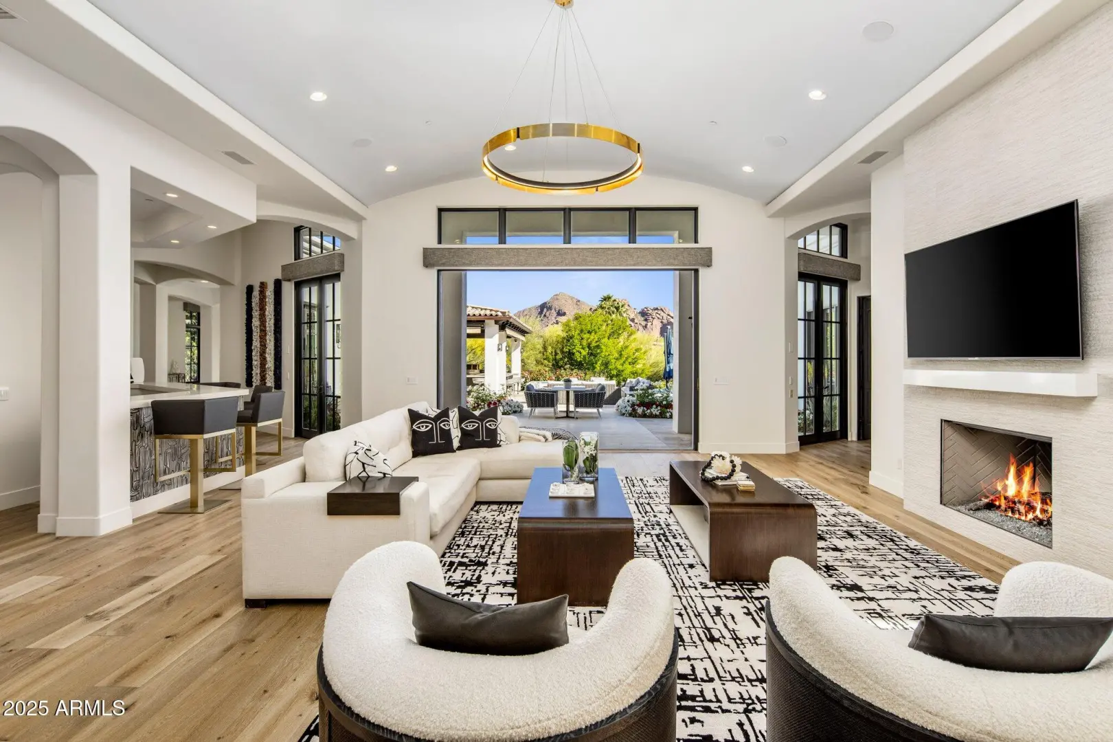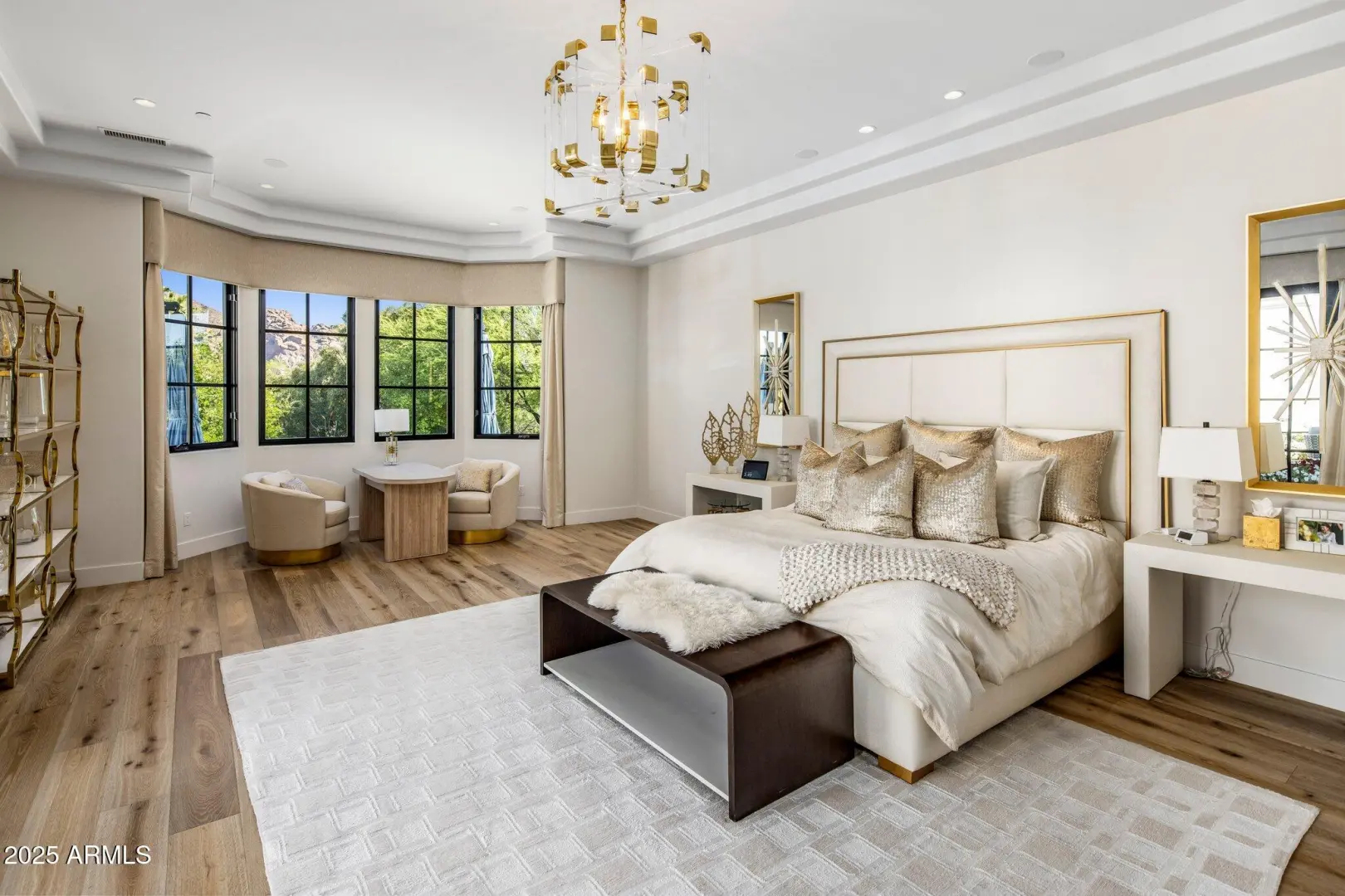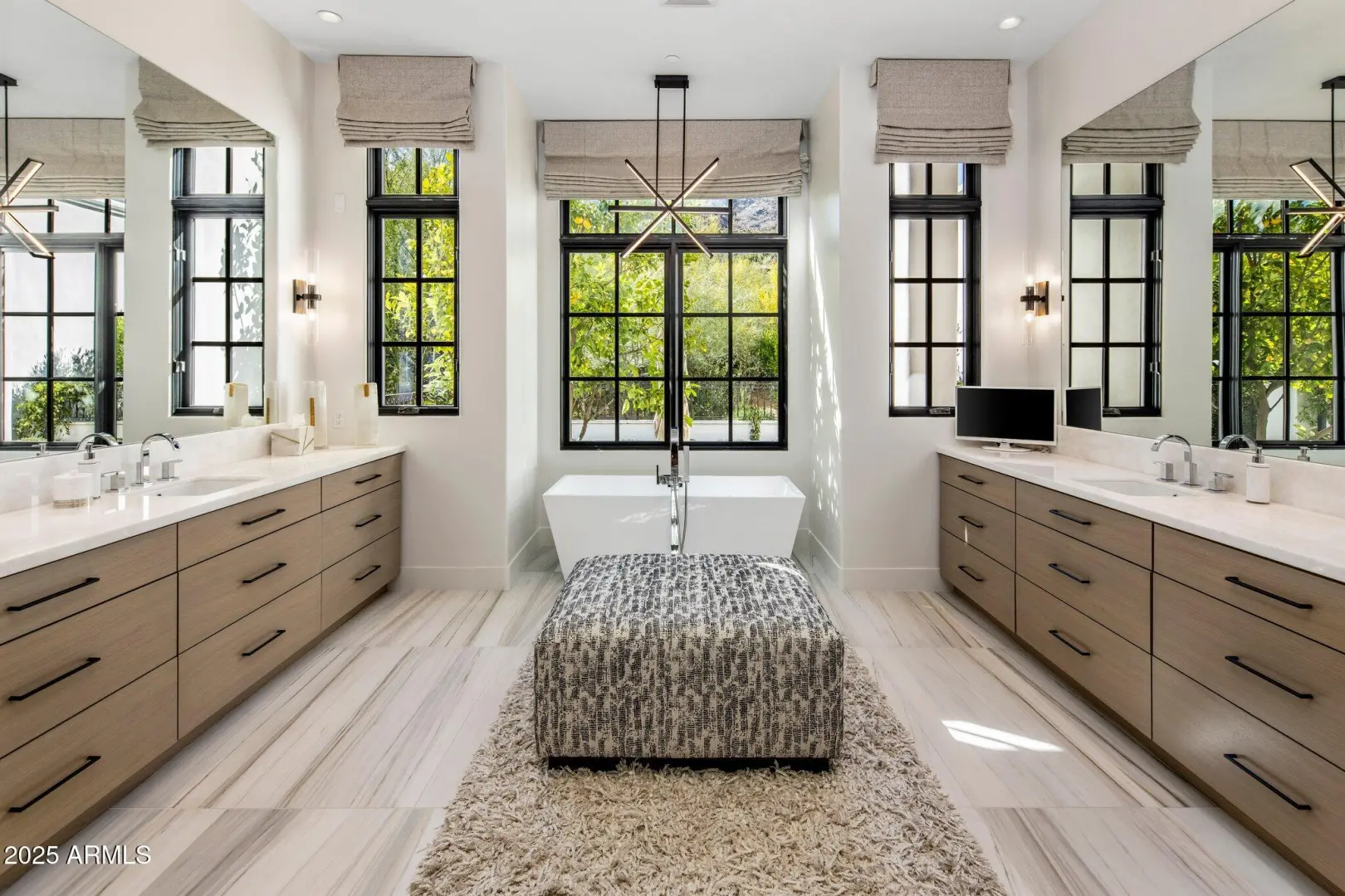Stop looking; you've found your dream home! This completely remodeled, one of a kind modern estate is sure to impress with its designer finishes and stylish flare, while still maintaining a luxurious Arizona feel. Walking through the entry path, hearing the trickle of the water feature and staring directly at Camelback Mountain, your jaw will hit the ground. Tall ceilings and a collapsing wall, perfectly frame Camelback Mountain. With 4 en-suite guest bedrooms, a stunning primary suite, plus a bonus room that would be ideal for office or play room there is plenty of space for everyone. Primary suite is a slice of heaven with cozy fireplace, sitting area, oversized bathroom and not just one, but two, oversized walk-in boutique clothing closets.