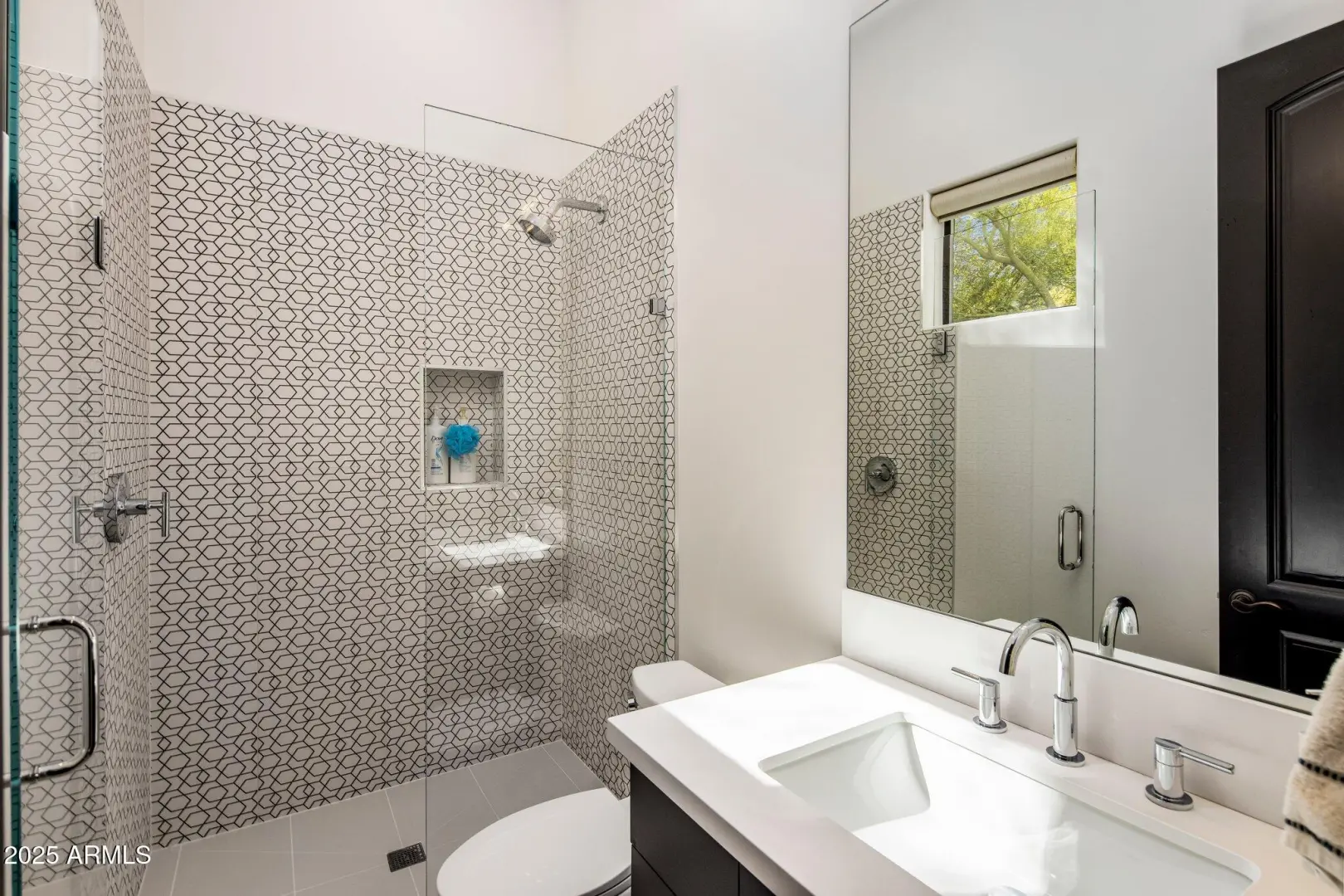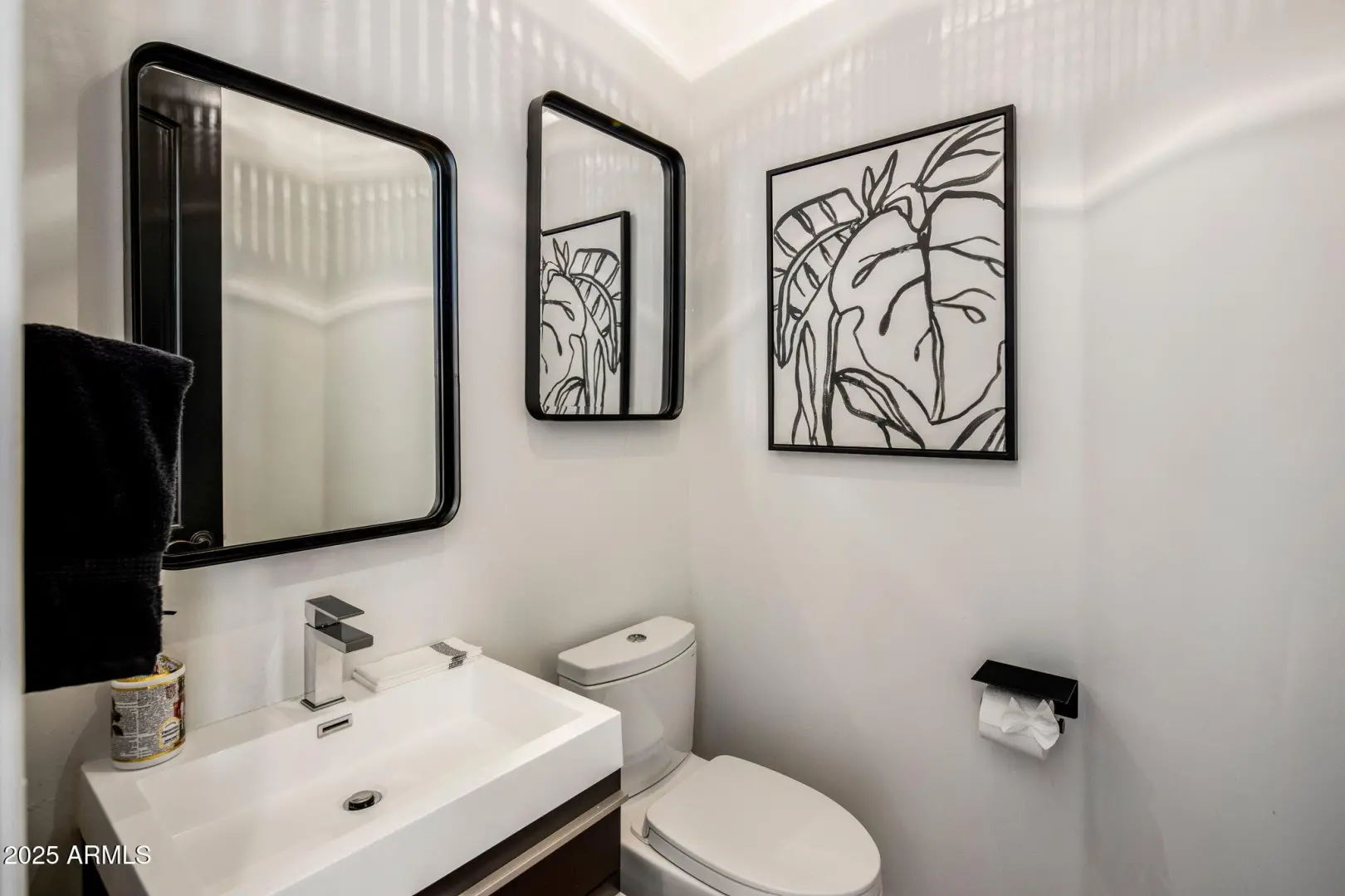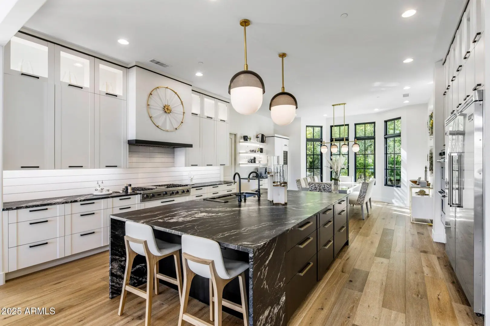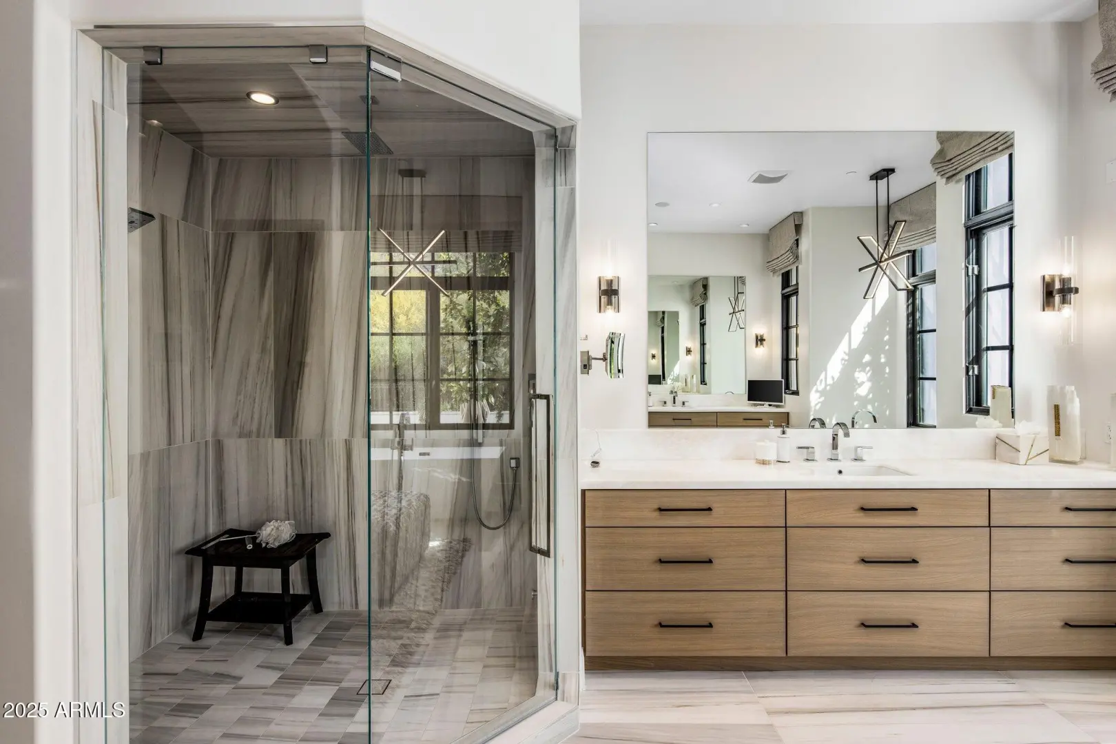Stop looking; you've found your dream home! This completely remodeled, one of a kind modern estate is sure to impress with its designer finishes and stylish flare, while still maintaining a luxurious Arizona feel. Walking through the entry path, hearing the trickle of the water feature and staring directly at Camelback Mountain, your jaw will hit the ground. Tall ceilings and a collapsing wall, perfectly frame Camelback Mountain. With 4 en-suite guest bedrooms, a stunning primary suite, plus a bonus room that would be ideal for office or play room there is plenty of space for everyone. Primary suite is a slice of heaven with cozy fireplace, sitting area, oversized bathroom and not just one, but two, oversized walk-in boutique clothing closets.