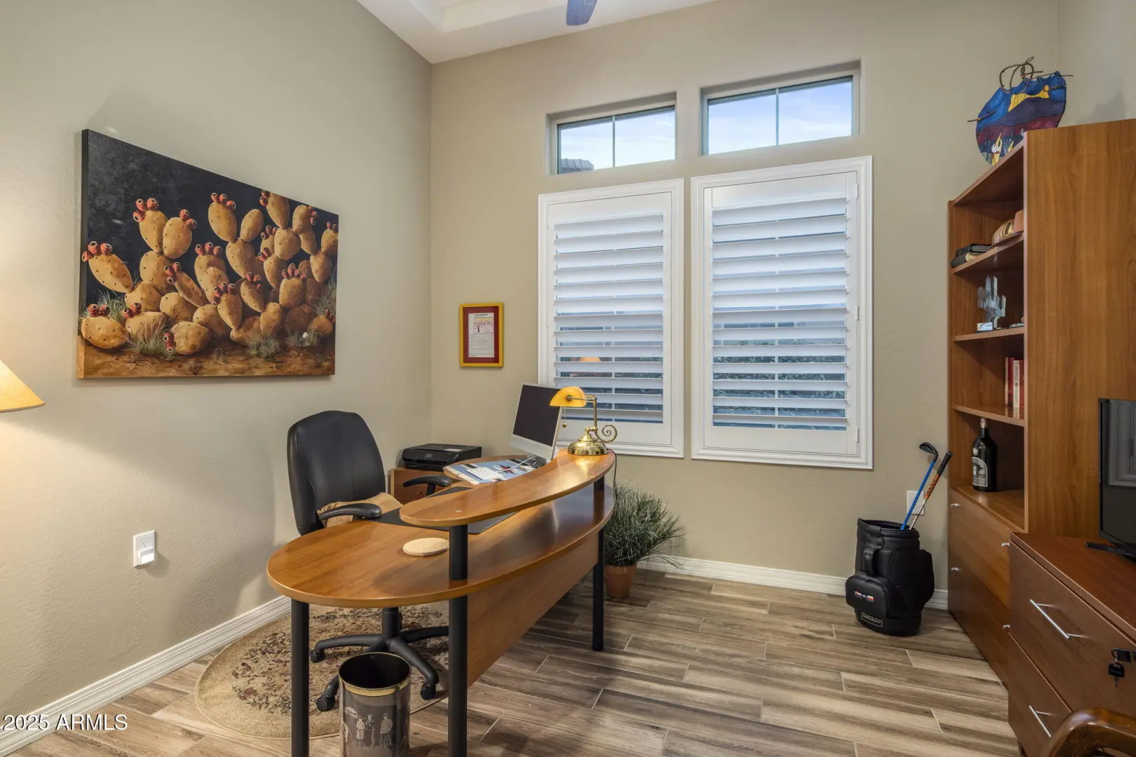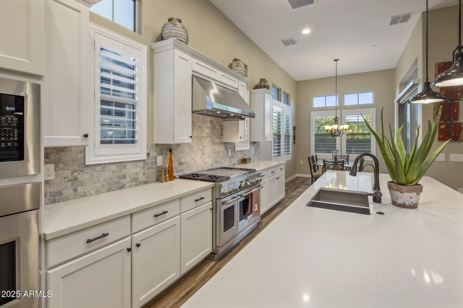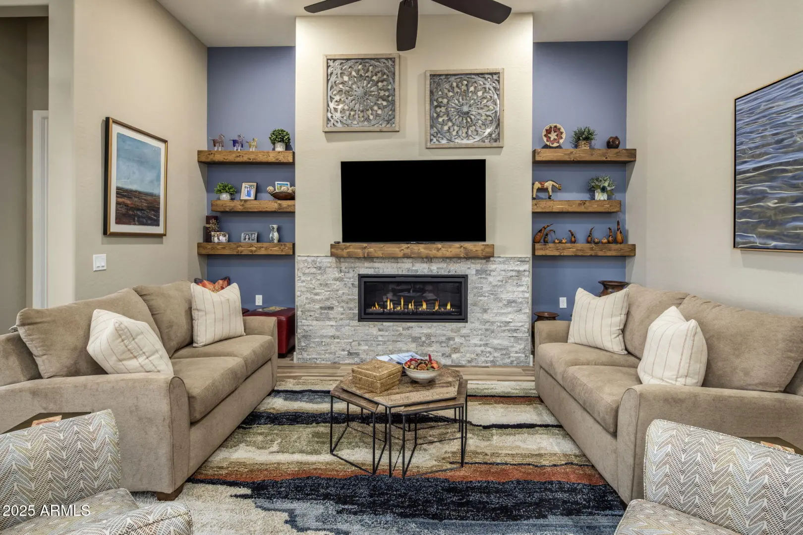 Enjoy sophisticated lock-n-leave living in this impeccably maintained single-level villa nestled within the coveted Scottsdale Heights community. Set against the backdrop of North Scottsdale's iconic boulder-strewn landscape, this home captures the essence of refined desert living blending comfort, elegance, and low-maintenance luxury living. The contemporary build by K Hovnanian welcomes you with brick finishes accentuating the entrance, opening to soaring ceilings & natural light highlighting the open concept floor plan. The inviting great room centers around a stacked-stone surround fireplace with custom floating shelves. The chef's kitchen is a true showpiece, featuring a large quartz waterfall island with seating, white shaker cabinetry, stainless steel appliances including gas