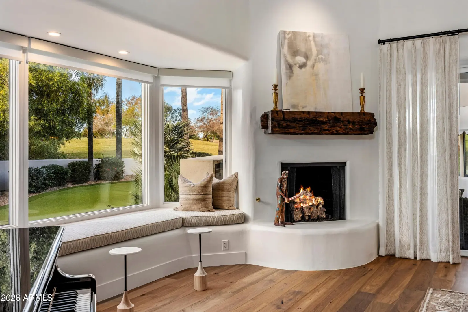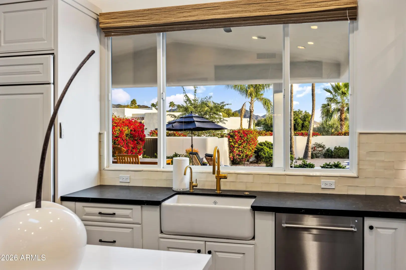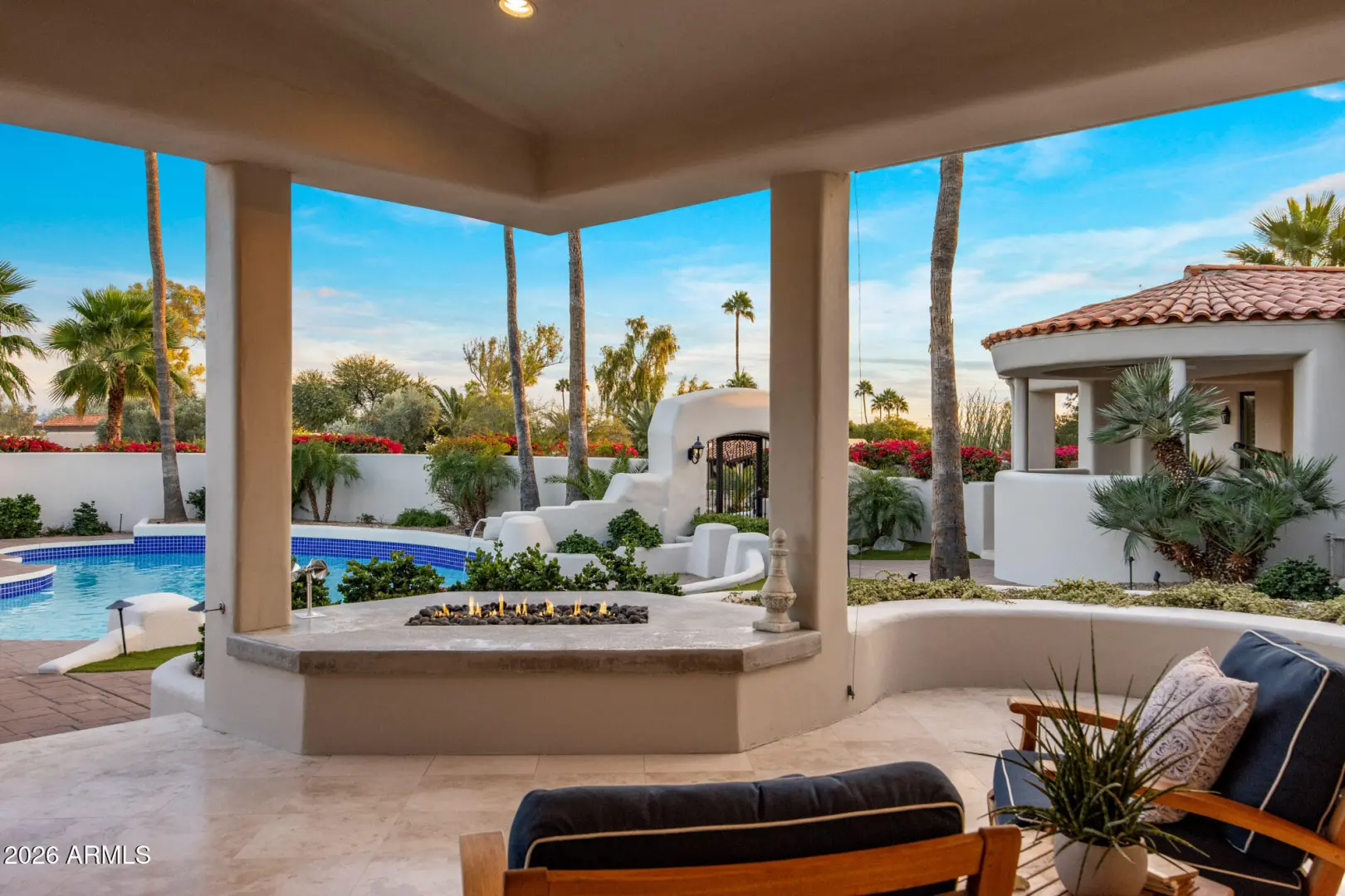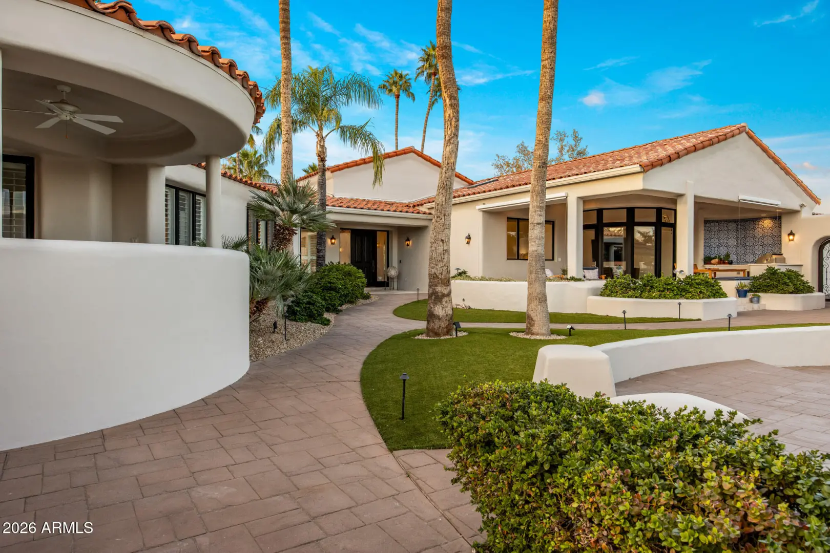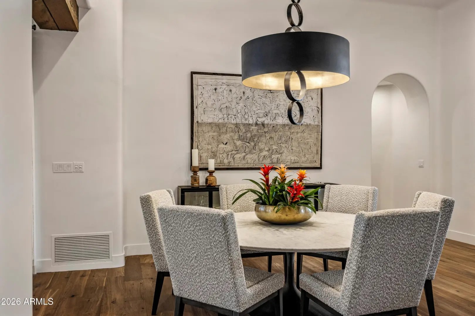 Refined living awaits within guard gated Pinnacle Peak Country Club Estates in this stunning, updated open residence with casita, perfectly set along the 18th fairway. Soaring wood-beamed ceilings, rich wood flooring and custom chandeliers frame beautifully updated finishes, thoughtfully integrated to preserve the home's original character and charm while elevating the experience for a clean, timeless aesthetic. At the heart of the home, a bright and airy kitchen delivers both style and performance with high-end stainless-steel appliances, a gas cooktop, generous gathering island with seating, custom cabinetry and quartz counters - all oriented toward the resort-style backyard with a private sparkling pool and inviting outdoor living spaces. The primary suite is a true